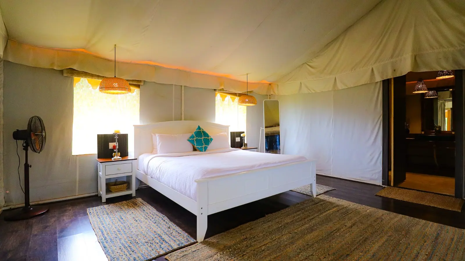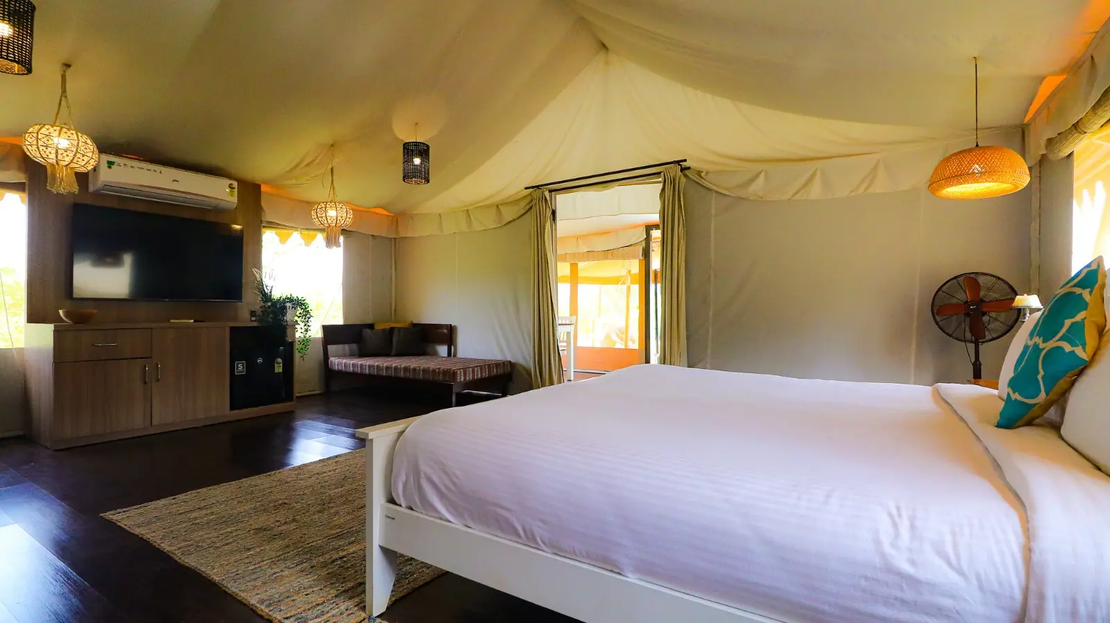 The African 1BHK Safari Tent brings the spirit of the wild into your stay, combining earthy tones, natural textures, and an open-to-nature design that captures the essence of safari living. Spread across 600 sq. ft., this spacious tent includes one bedroom, a large bathroom, and a comfortable living and dining area, creating the ideal countryside retreat for couples or small families.