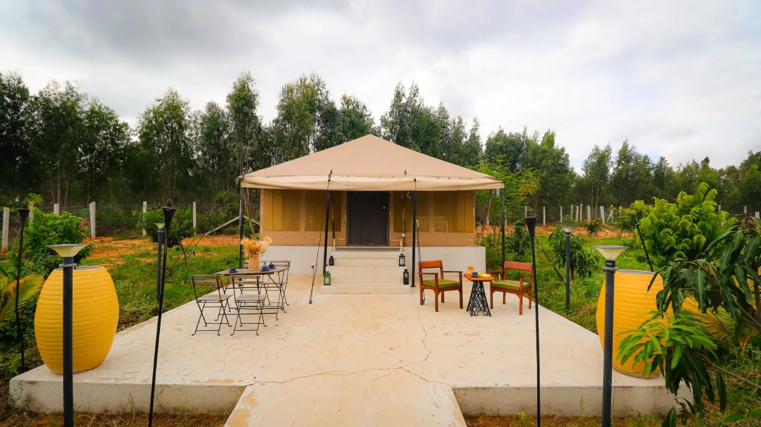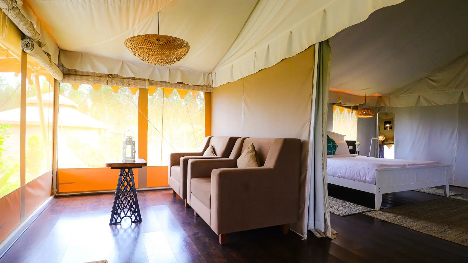 Evoking royal grandeur with Rajasthani-inspired design, the Maharaja Tent offers two spacious bedrooms, elegant living and dining areas, and a private deck with garden access. Complete with a private bonfire pit and panoramic views of greenery, ponds, and sunrise/sunset skies — it’s crafted for families and groups seeking regal comfort in nature.