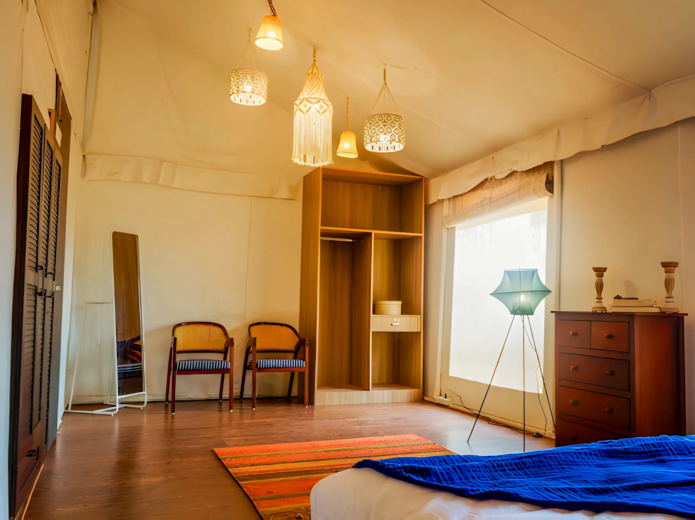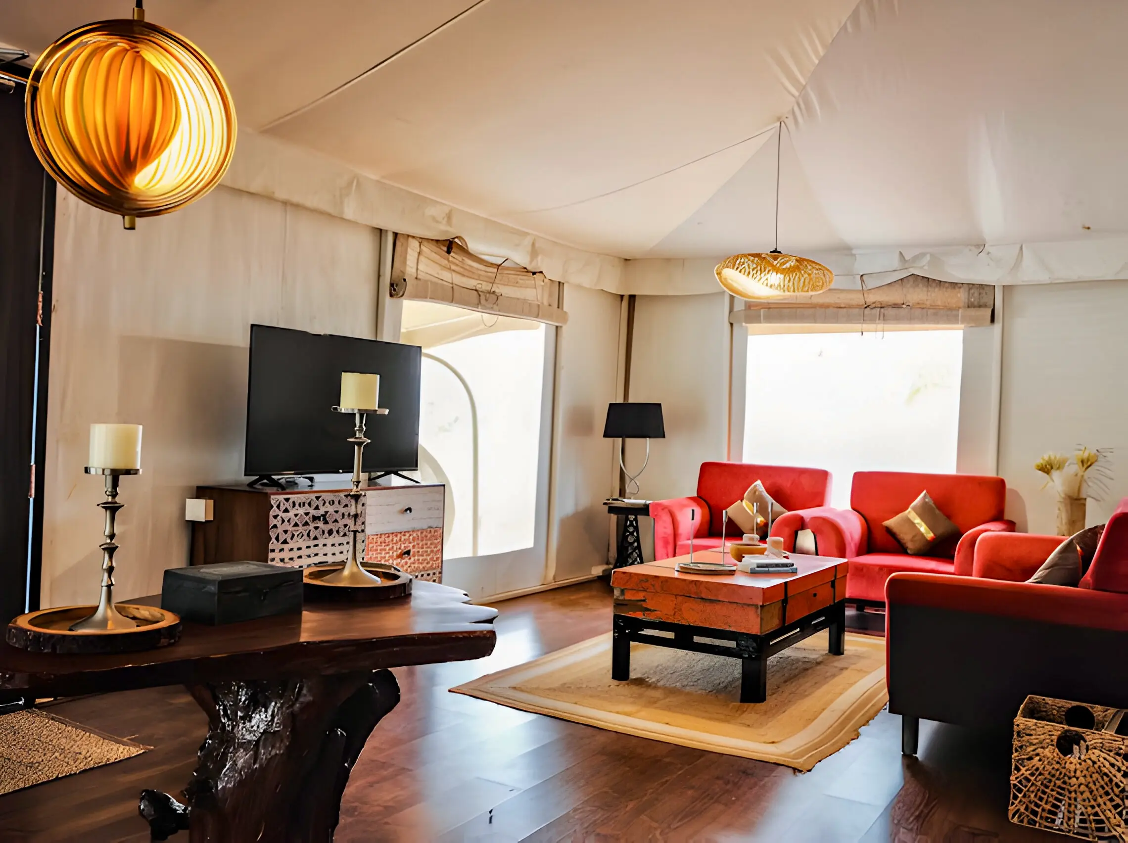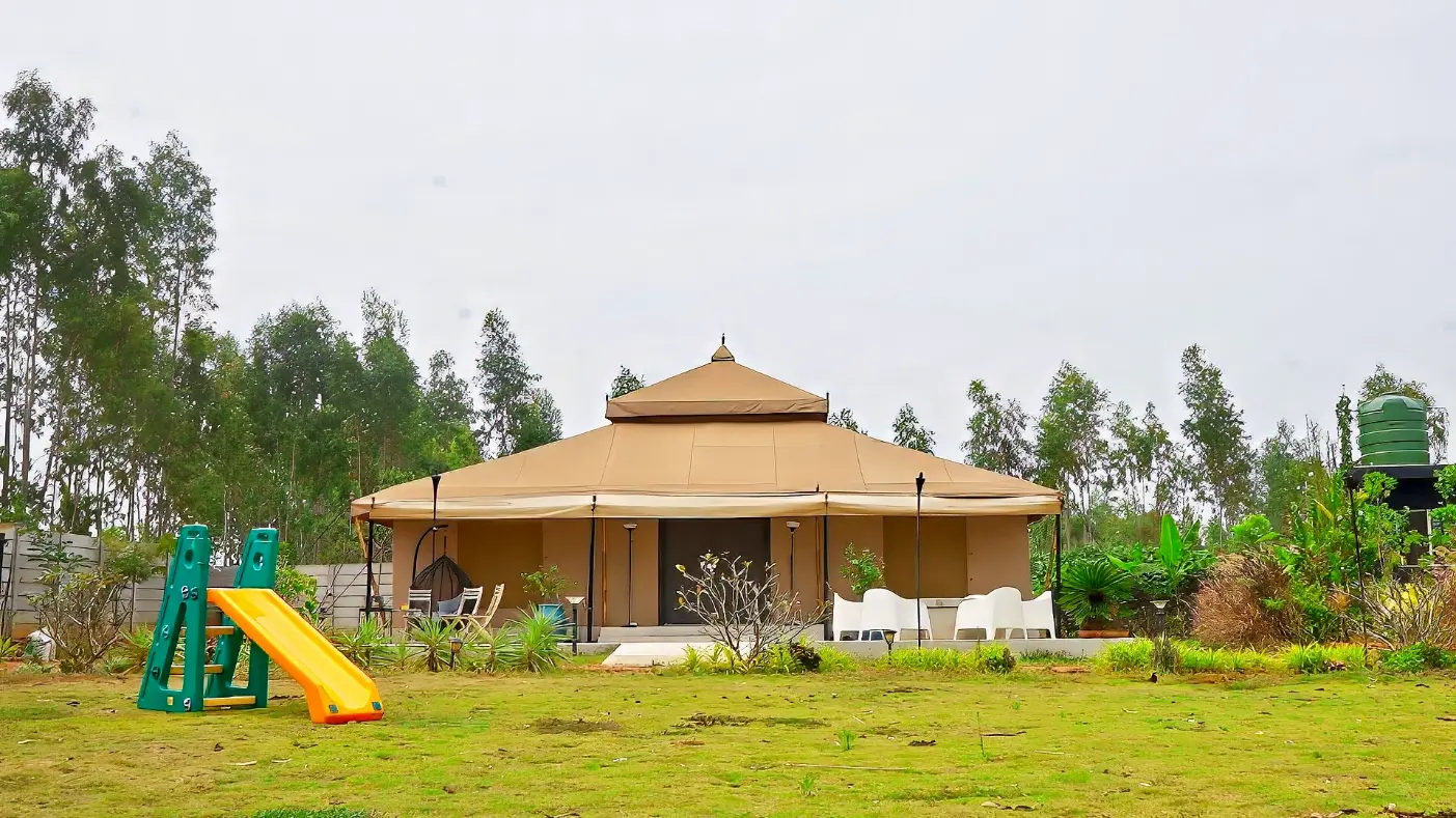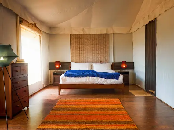 The Maharaja 2BHK Tent evokes royal grandeur, inspired by Rajasthani haveli design and heritage living. Spanning 1,500 sq. ft., it features two spacious bedrooms, two bathrooms, and elegant living and dining areas that bring regal charm into the countryside. Rich furnishings and spacious interiors create an ambiance of luxury, while every corner is designed for comfort and elegance.