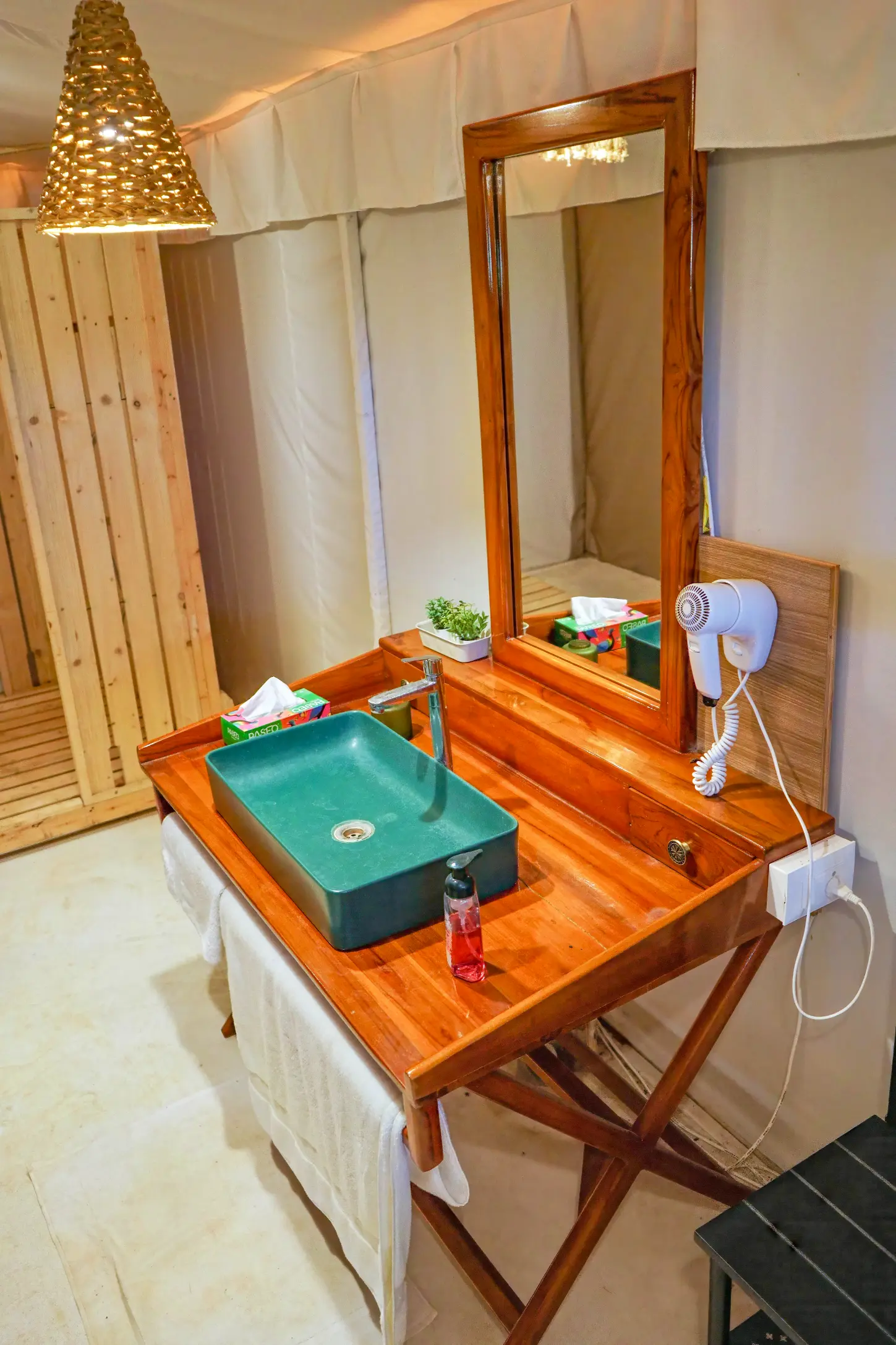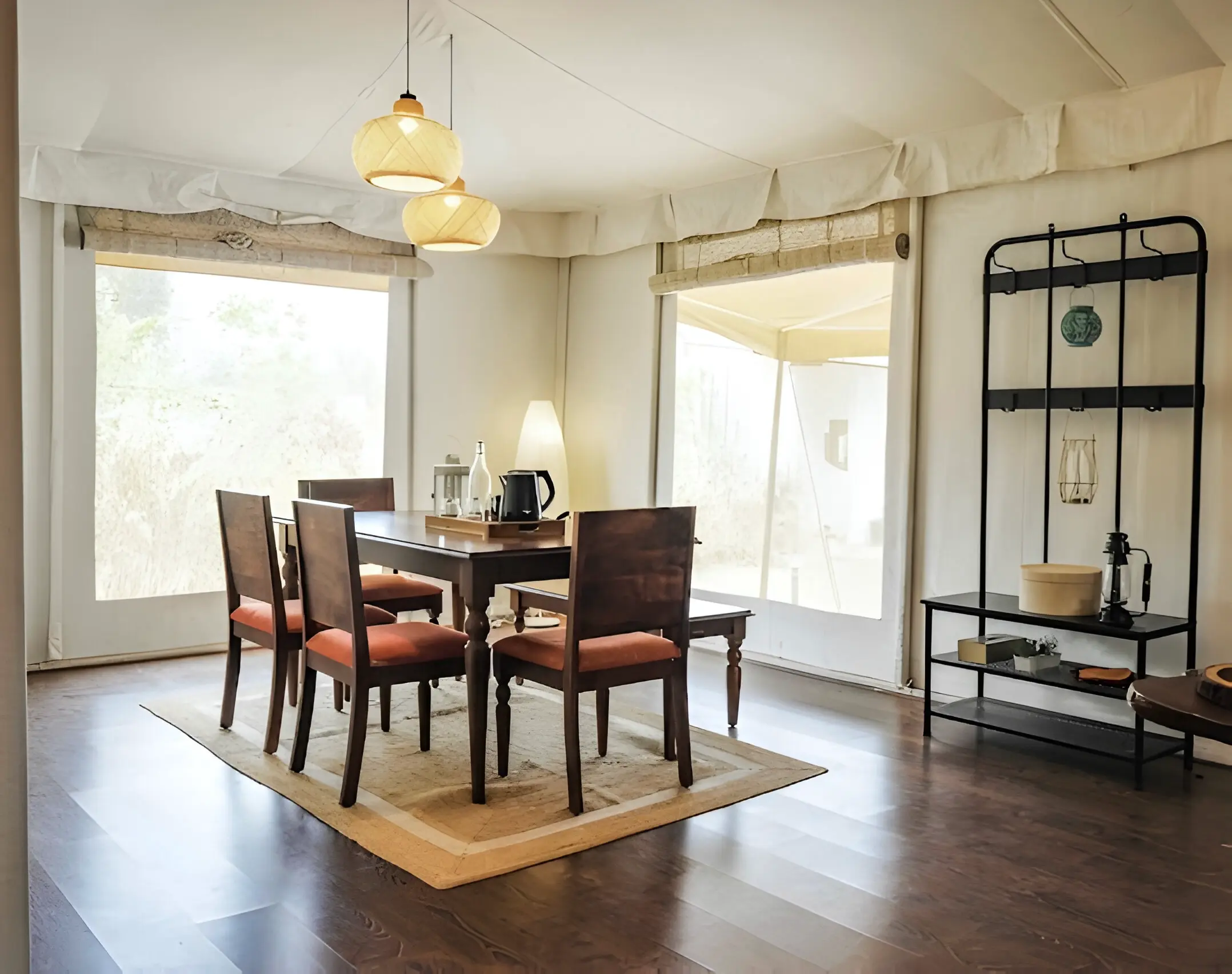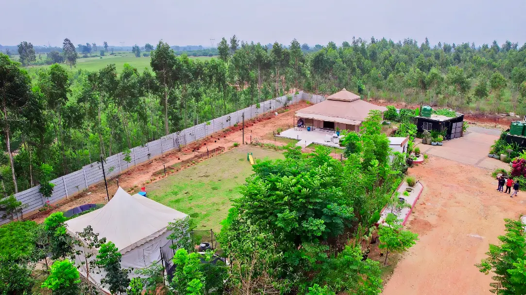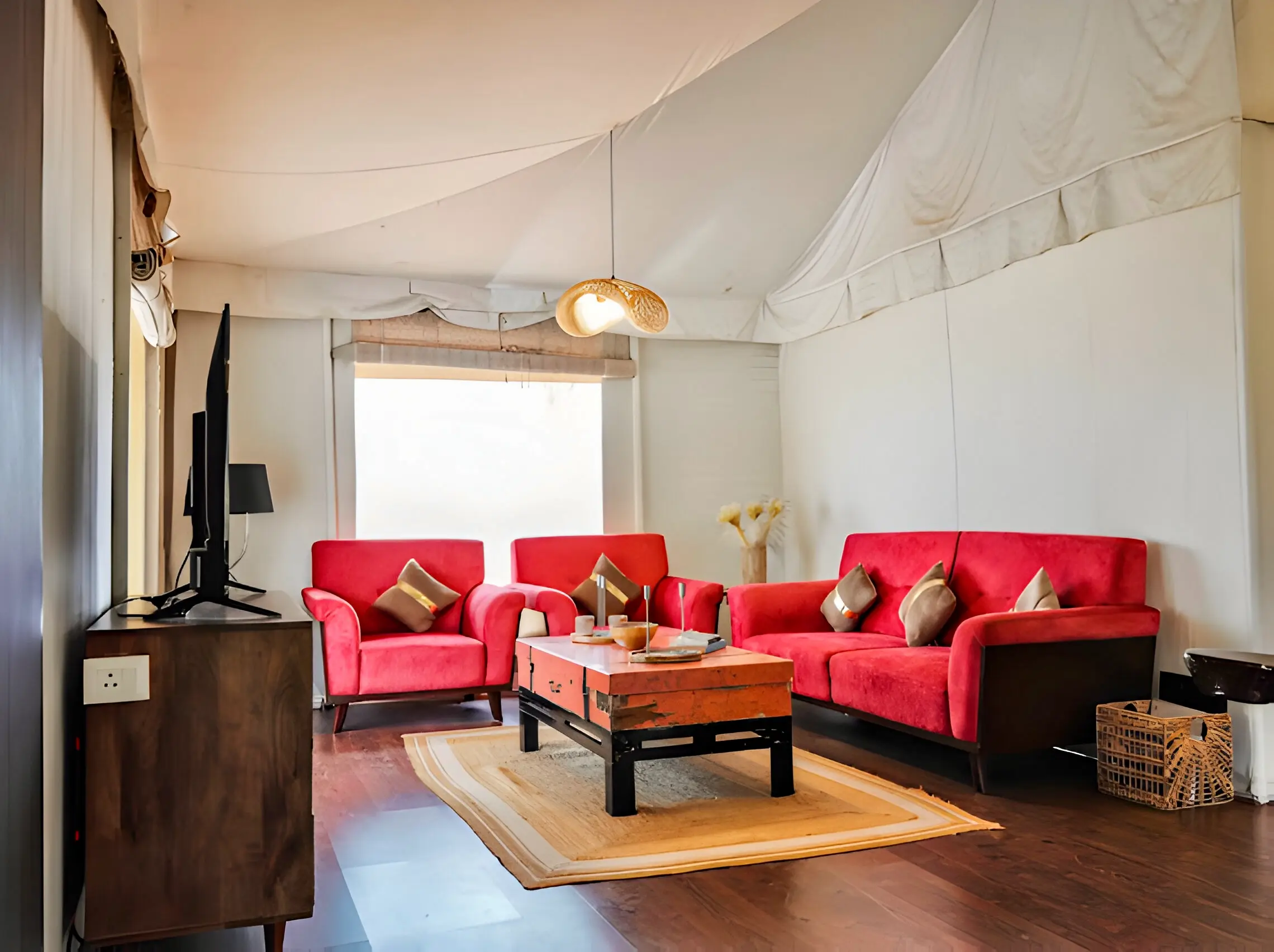 The Maharaja 2BHK Tent evokes royal grandeur, inspired by Rajasthani haveli design and heritage living. Spanning 1,500 sq. ft., it features two spacious bedrooms, two bathrooms, and elegant living and dining areas that bring regal charm into the countryside. Rich furnishings and spacious interiors create an ambiance of luxury, while every corner is designed for comfort and elegance.