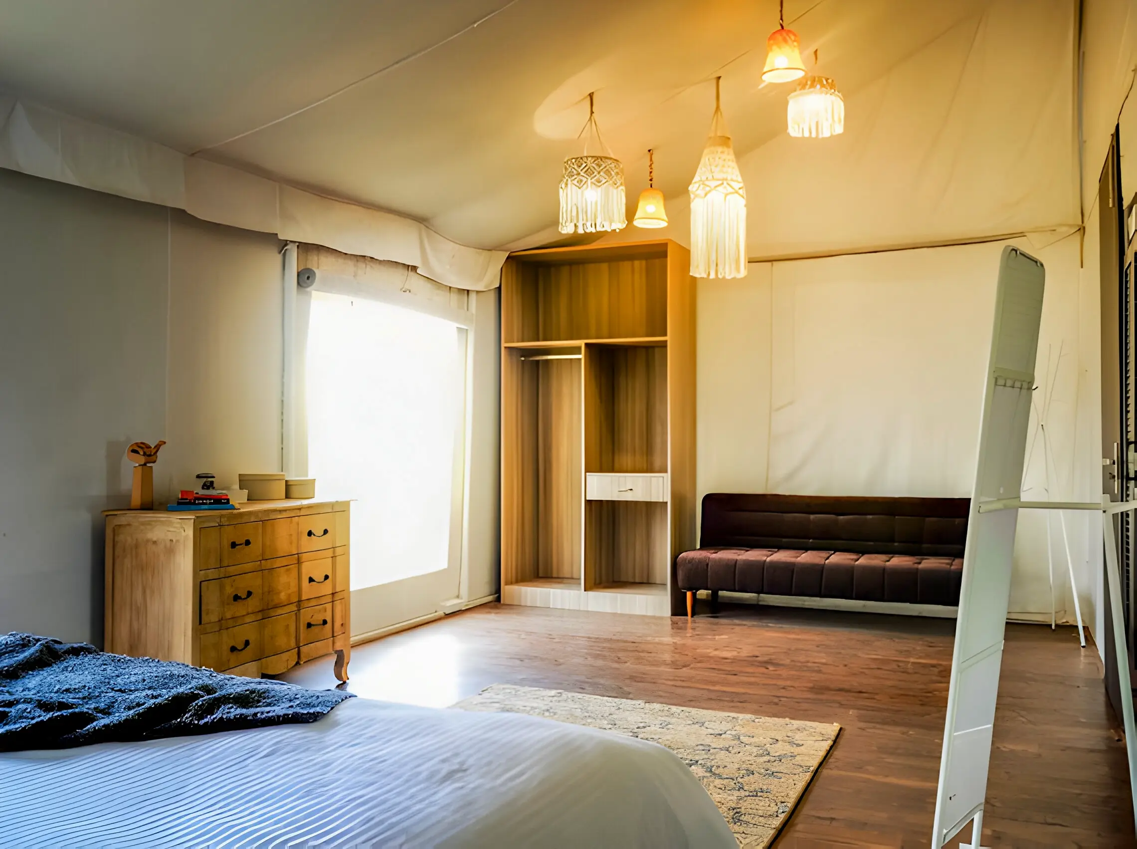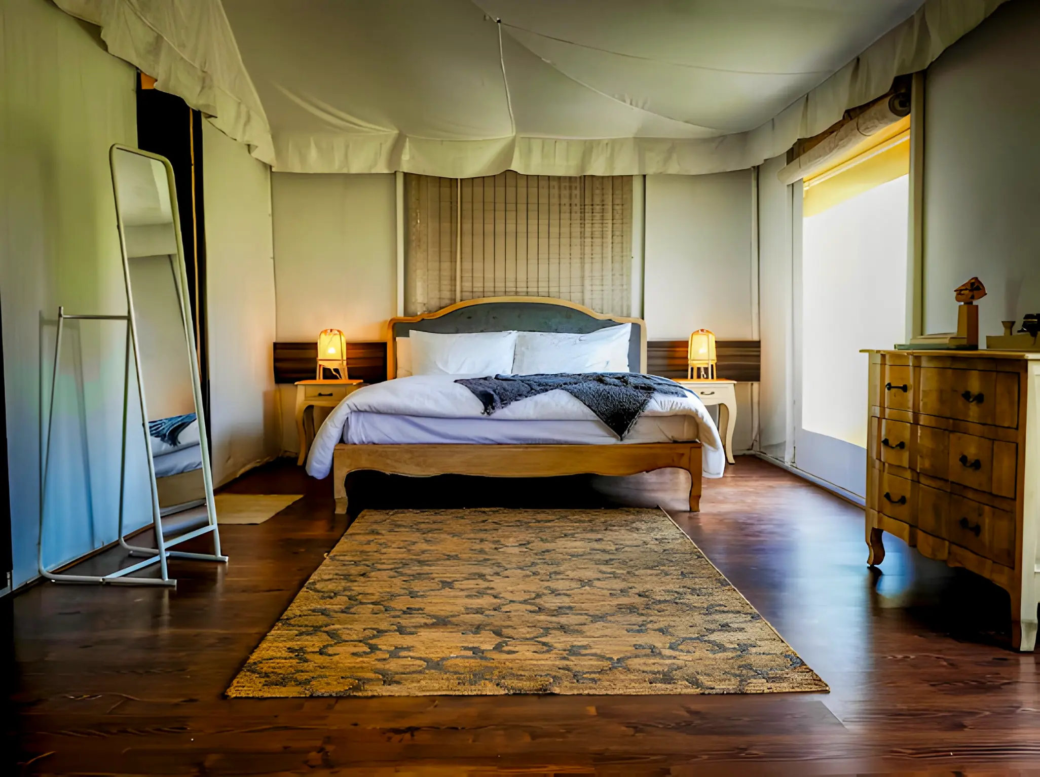 Inspired by the African wilderness, this 1BHK Safari Tent blends earthy textures with modern comfort. With a spacious bedroom, open living space, and a private deck overlooking gardens and sunset skies, it’s crafted for couples and small families seeking adventure with ease.