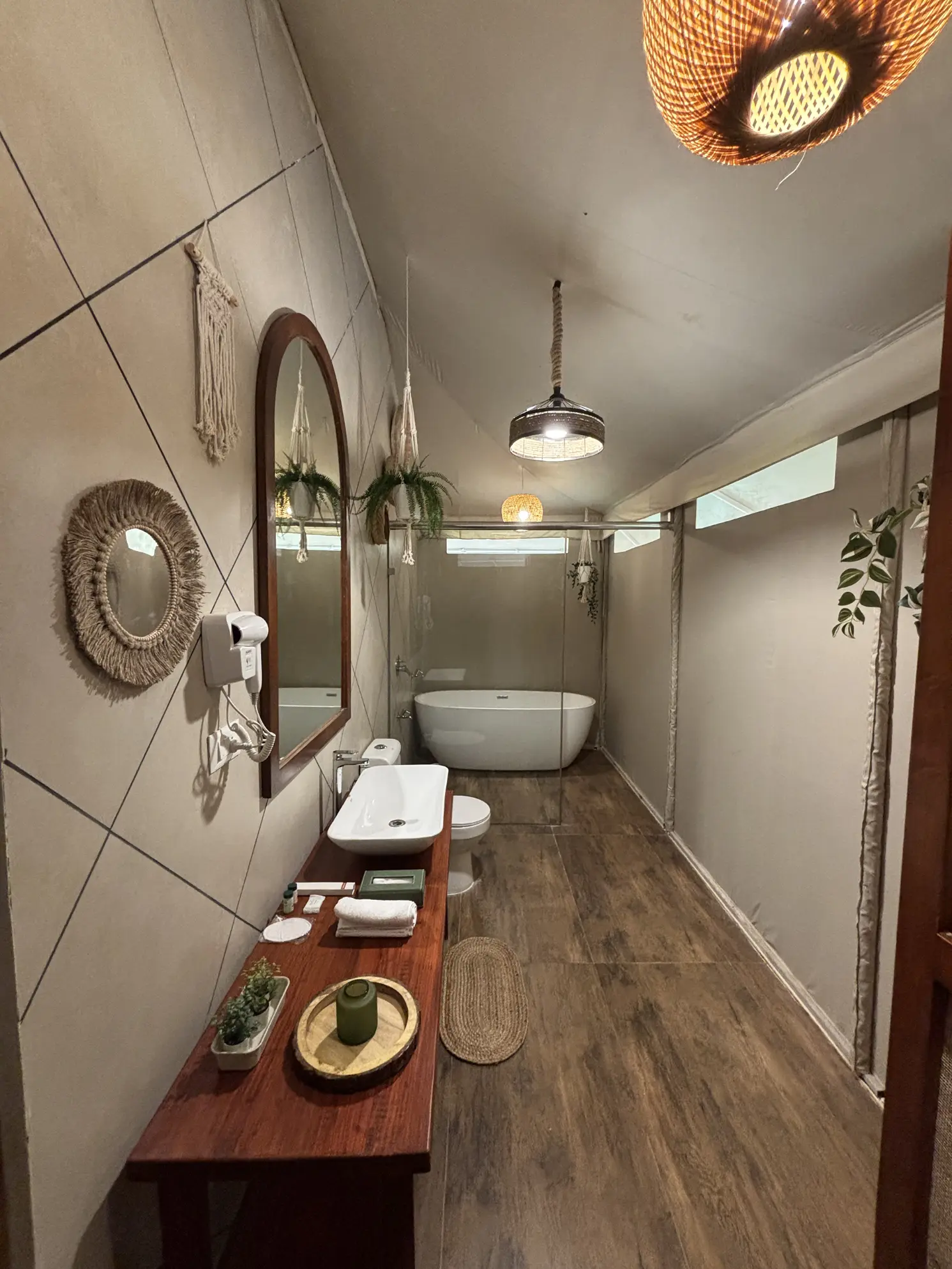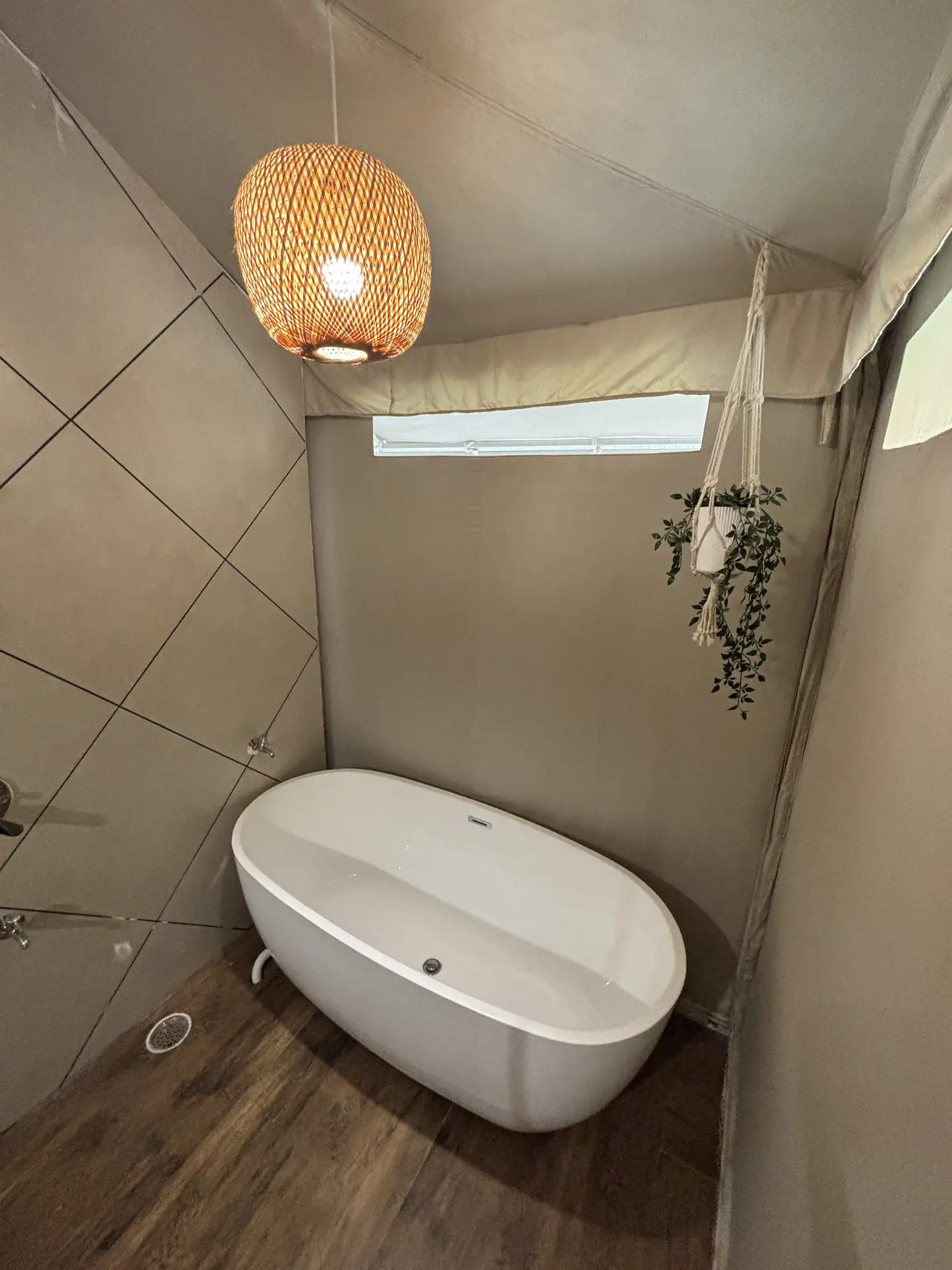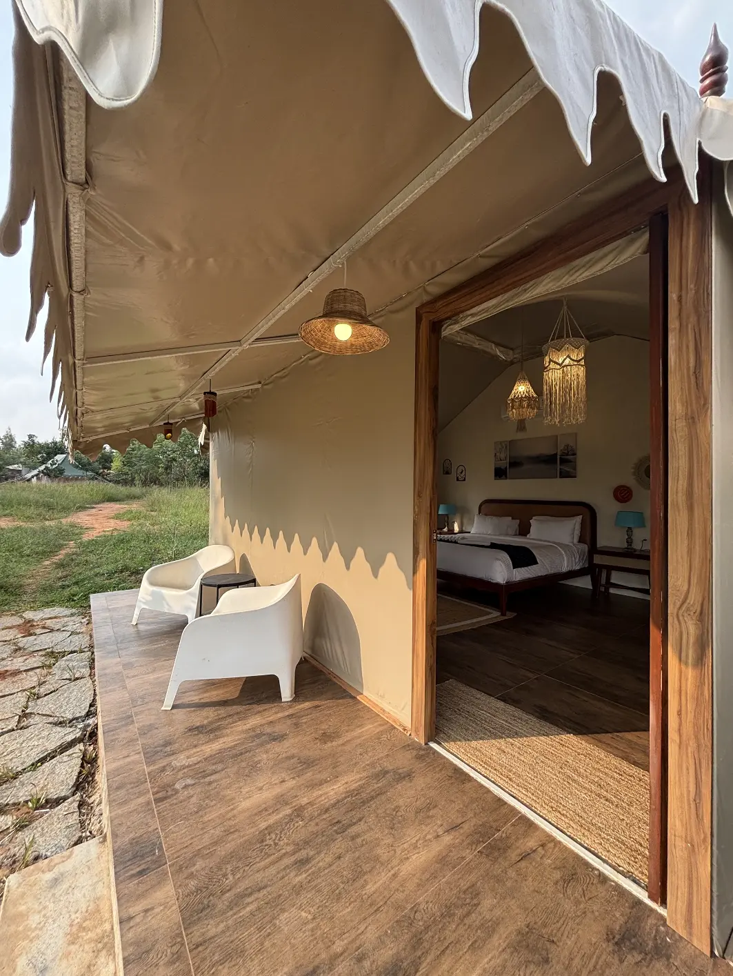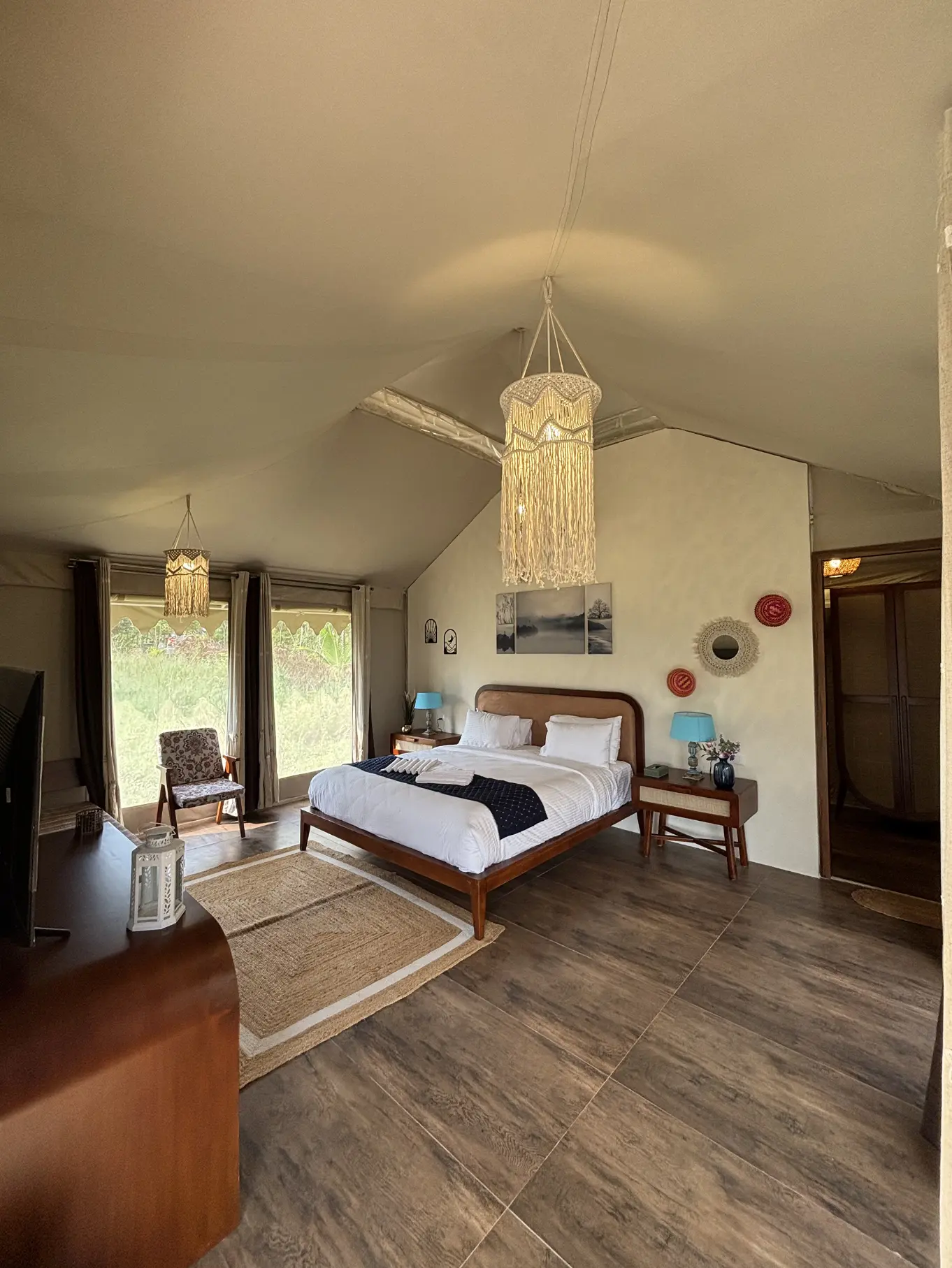 Inspired by the African wilderness, this 1BHK Safari Tent blends earthy textures with modern comfort. With a spacious bedroom, open living space, and a private deck overlooking gardens and sunset skies, it’s crafted for couples and small families seeking adventure with ease.