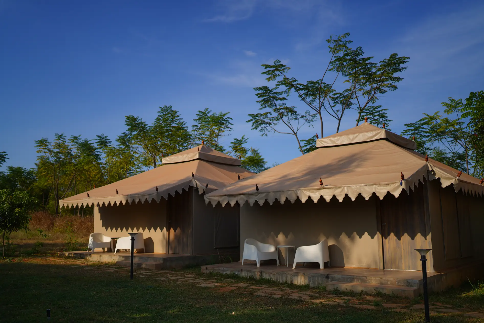 Evoking royal grandeur with Rajasthani-inspired design, the Maharaja Tent offers two spacious bedrooms, elegant living and dining areas, and a private deck with garden access. Complete with a private bonfire pit and panoramic views of greenery, ponds, and sunrise/sunset skies — it’s crafted for families and groups seeking regal comfort in nature.